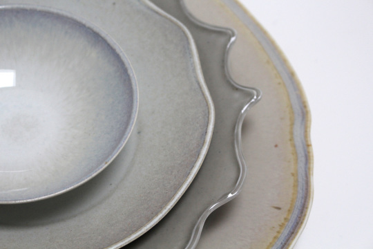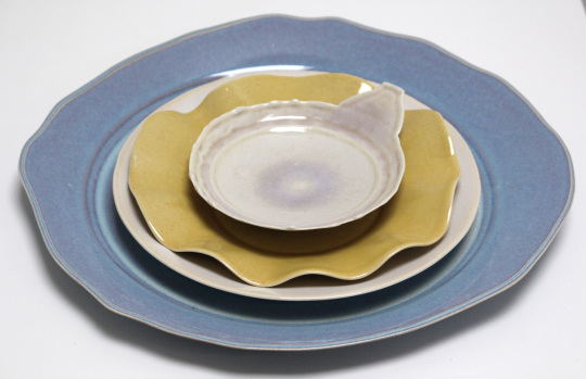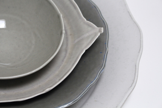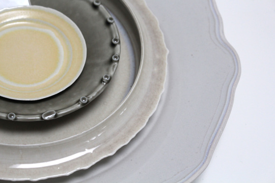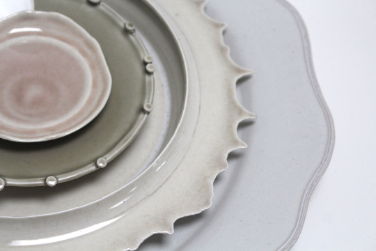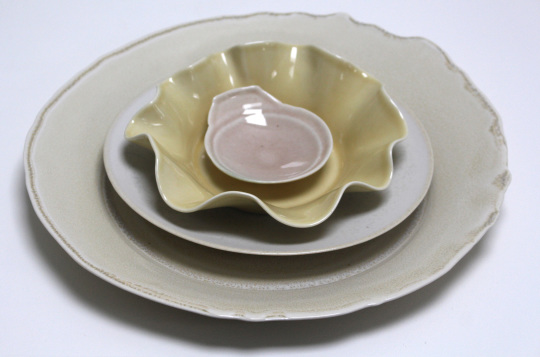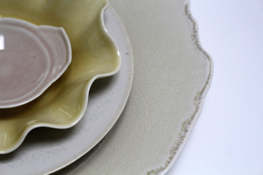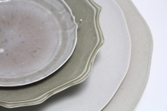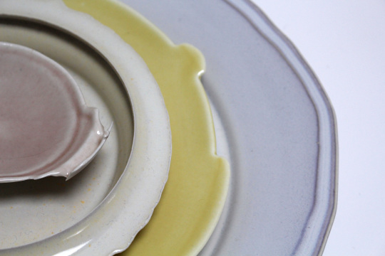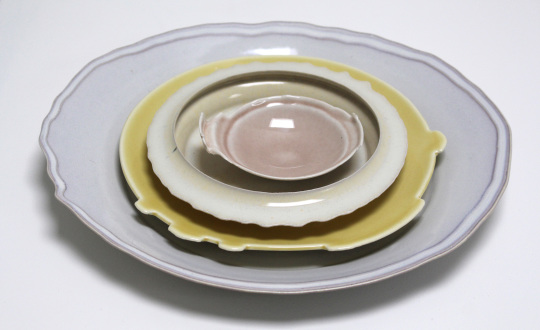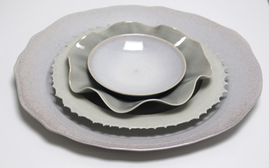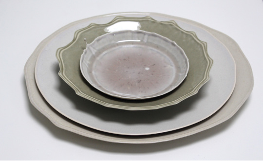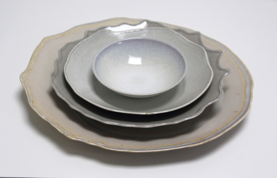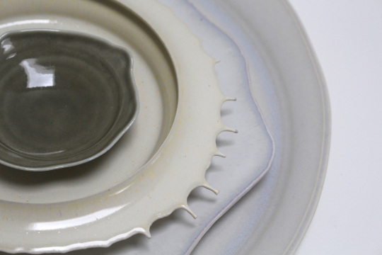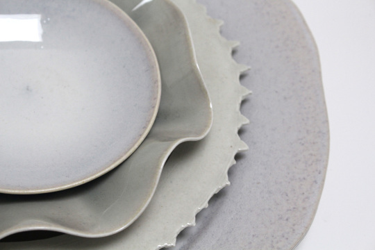 The Dinnerware, each consisting of 2 sets // 4 parts are handmade in porcelain on the artist's own workshop in Copenhagen. Each part is unique and she uses various techniques to create the individual forms. The glazes are developed by the artist.