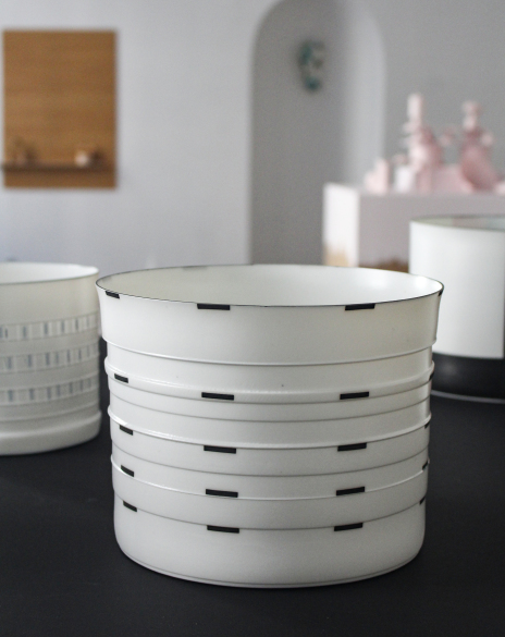 Bodil Manz (DK) generally explores 'the vessel' in her work. The exhibition shows her latest porcelain cylinders - paper-thin, with sharp geometric decorations and a subtle perforation that opens the body up to reveal the interior space. Through her longstanding work with porcelain Bodil Manz has developed a unique sense of the material's capacity and poetic presence.