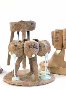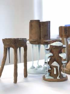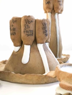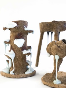 Christina Schou Christensen generally views her works as experiments. She explores a field that is hard to control, and where the outcome is difficult, if not impossible, to predict. She sets certain parameters for the unfolding of the materials, but the process and the interactions among the materials are crucial for the outcome. In traditional serial production, the ceramicist’s emphasis is on controlling the process and minimizing the accidents that almost inevitably occur in the kiln from time to time, such as objects cracking or falling over or glaze failing to bind to the clay. In Christina Schou Christensen’s work, these ’disasters’ are desirable outcomes that point the way to new possibilities and expression. Glaze in particular is a key focus of her work. Traditionally, ceramic glaze is used to make utilitarian objects user-friendly and durable. But when exposed to the highest temperatures in the kiln, glaze is in fact liquid glass with unique properties and potentials. In Christina Schou Christensen’s work, glaze is not merely a coating that affects the colour and texture of a piece but an equal form element in its own right, capable of radically altering the form of the object.